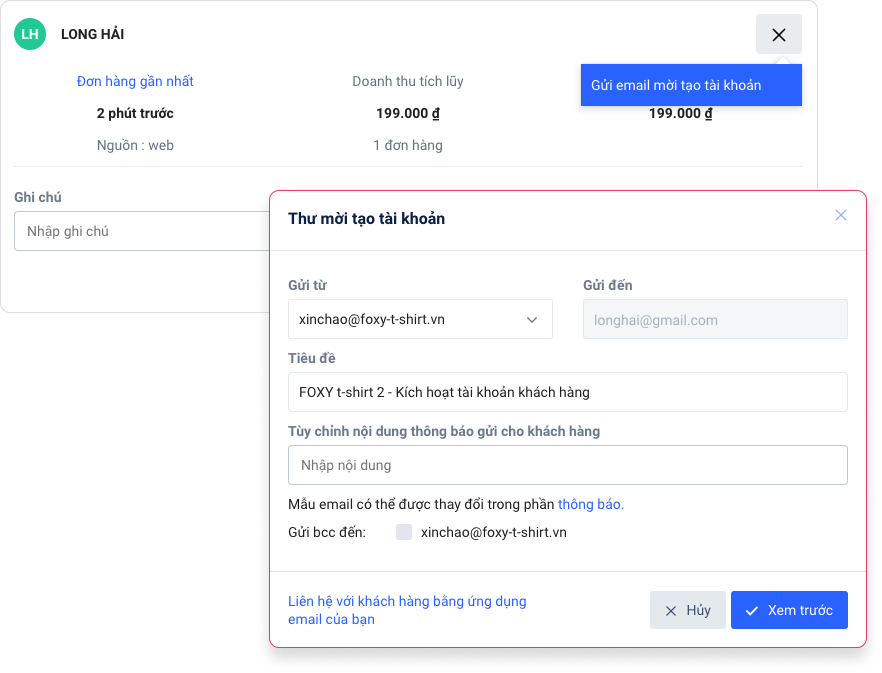 - Sau khi kiểm tra thông tin chính xác, bạn chọn nút Xem trước để tiếp tục xem nội dung email sẽ gửi cho khách hàng. Nếu tất cả đều ổn, bạn nhấn chọn Gửi email để hoàn tất.