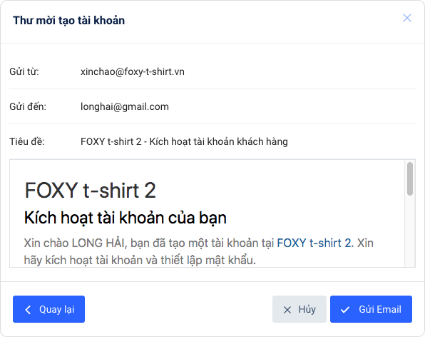 - Kiểm tra lại các thông tin, tiêu đề và nội dung của email. Bạn có thể tùy chỉnh nội dung thông báo trực tiếp trong hộp thoại này, hoặc truy cập mục Cấu hình → Thông báo → Nội dung email → Kích hoạt tài khoản khách hàng.