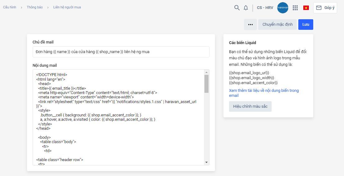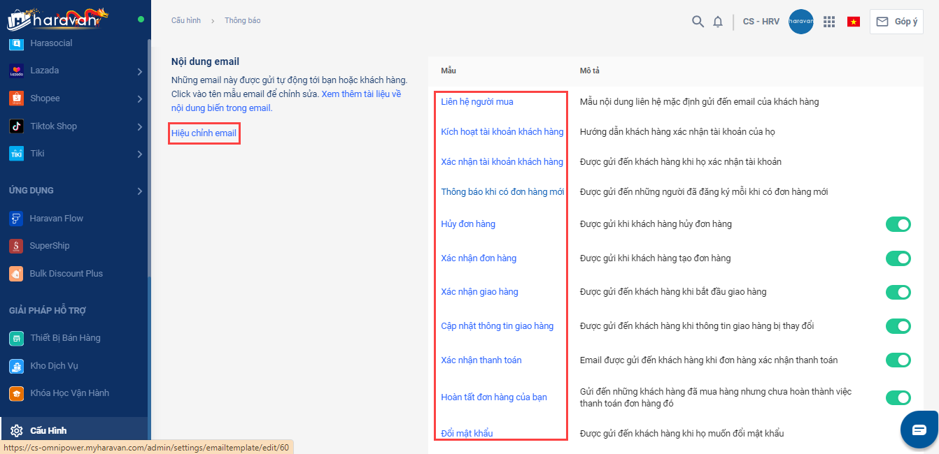 Để thay đổi nội dung email thông báo đơn hàng, bạn truy cập mục Cấu hình ➨ Thông báo