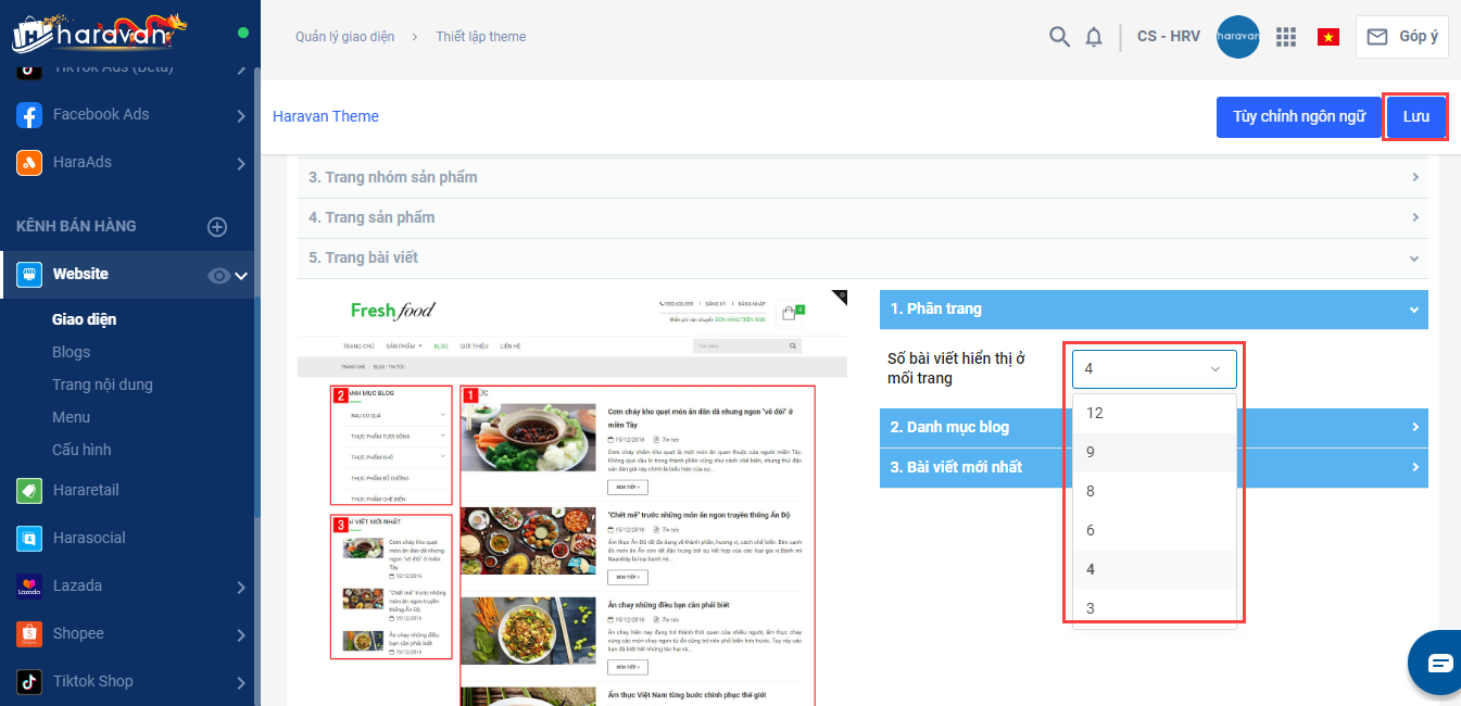 Trong mục Phân trang, bạntùy chỉnh số lượng bài viết và chọn Lưu để hoàn tất