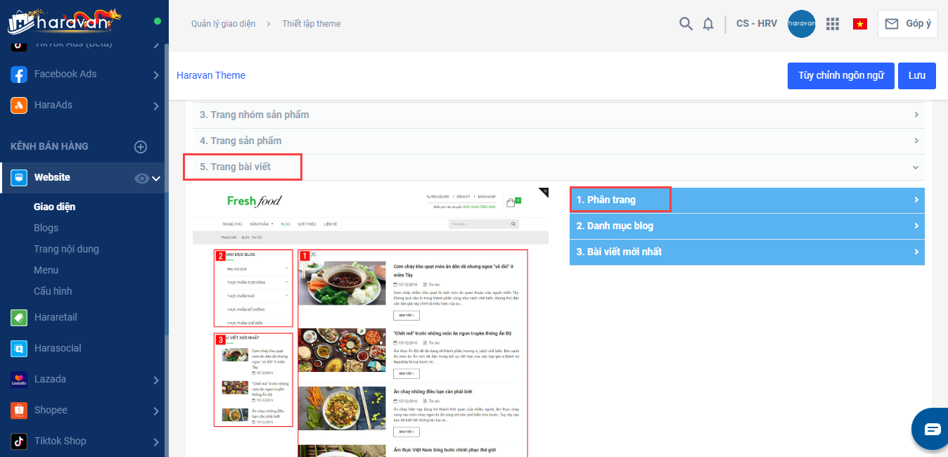 Để thực hiện, bạn vào trong Thiết lập theme ➨ chọn mục Trang bài viết