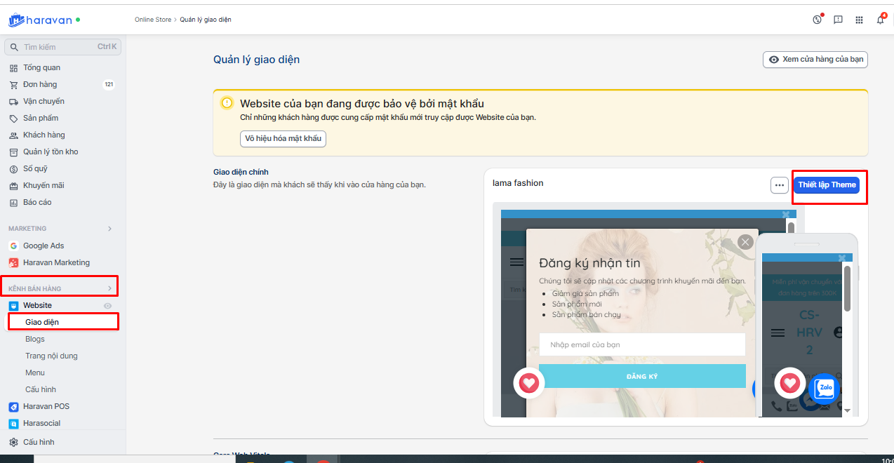 - Kênh bán hàng → Website → Giao diện → Thiết lập Theme.