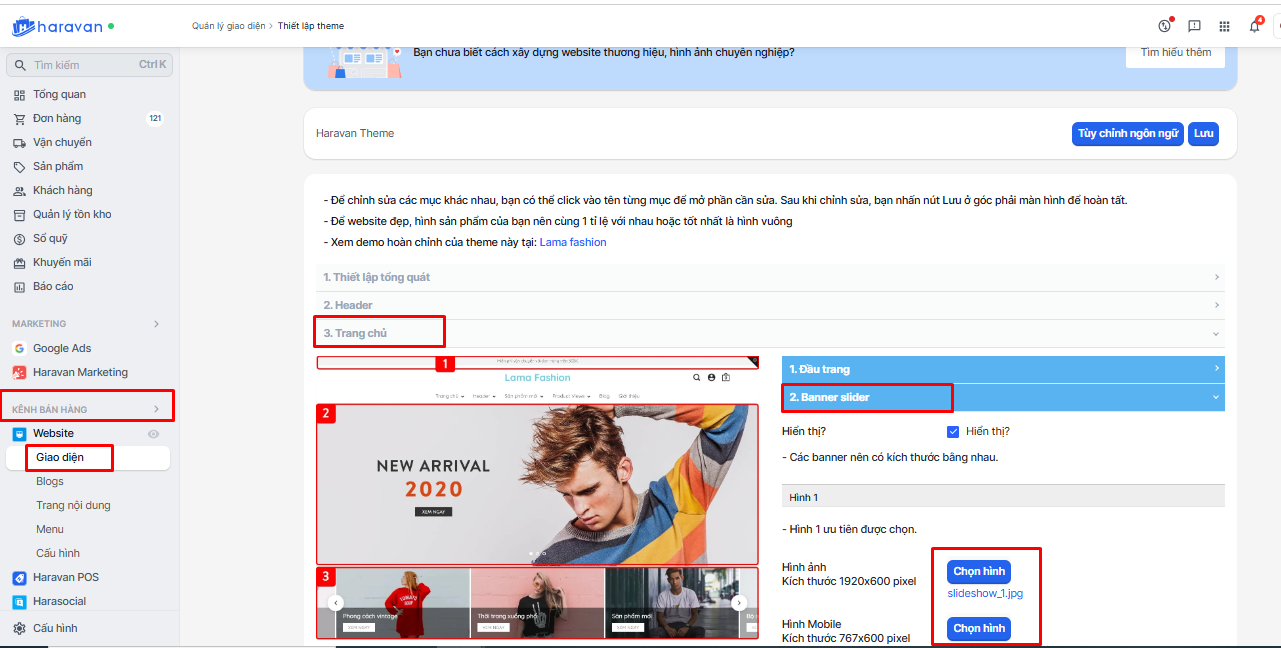 - Vào mục Trang chủ → chọn phần Banner slider (hoặc tương tự, tùy theo theme).
