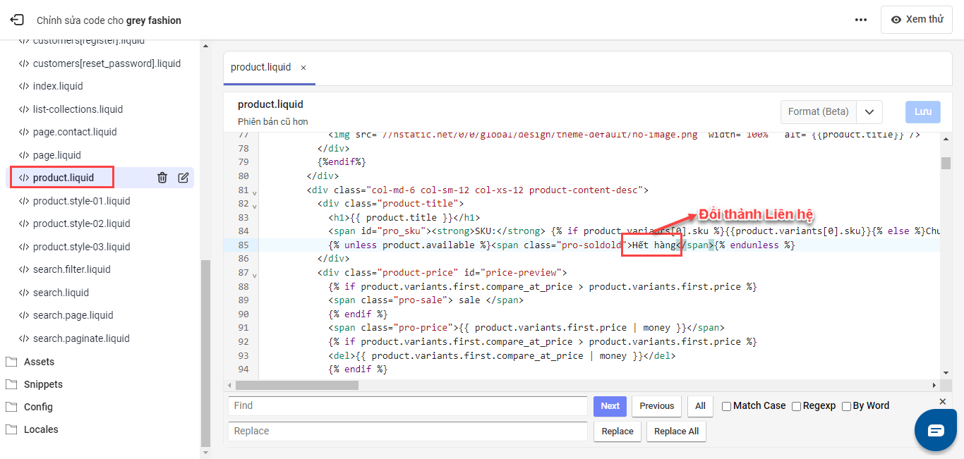 - Bạn tìm phầnproduct.title, xóa tiêu đề Hết hàng và sửa thành Liên hệ.