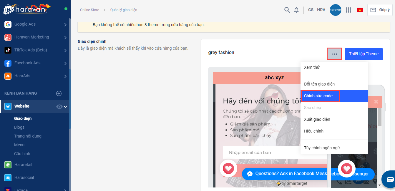 - Từ Trang quản trị->chọnWebsite->chọnGiao diện->chọn biểu tượng tùy chọn bên cạnh Thiết lập theme->chọnChỉnh sửa code