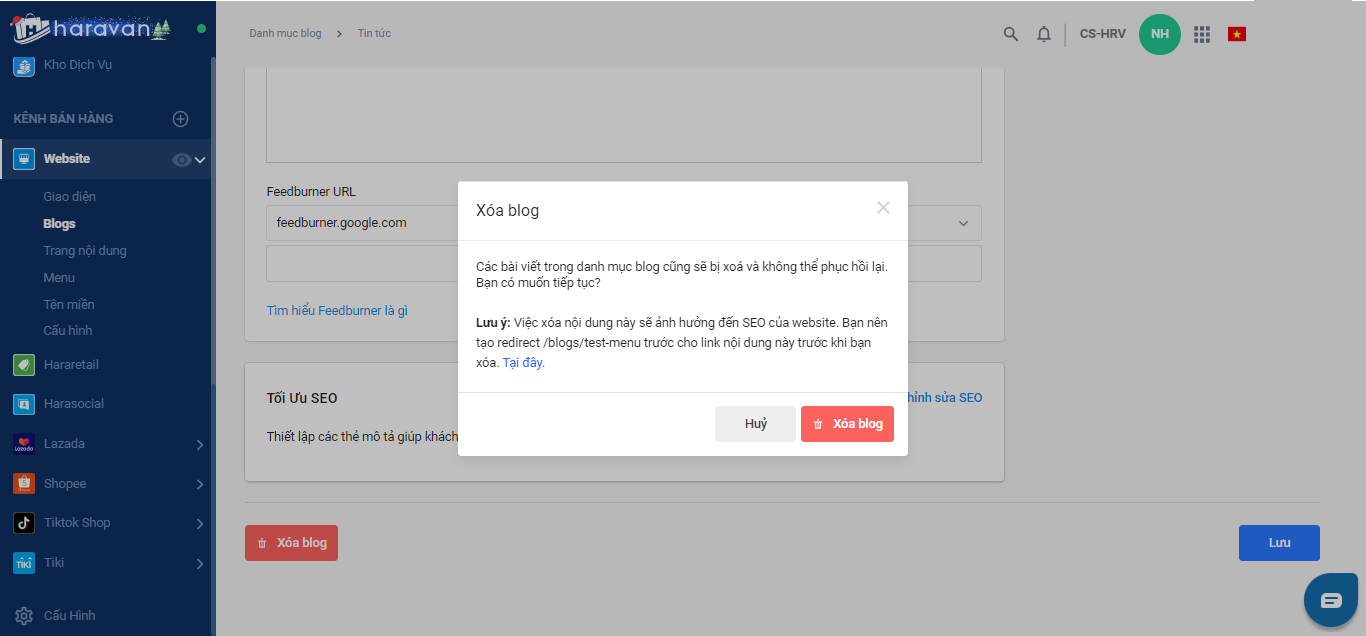 Khi thực hiện xóa danh mục blog, Haravan sẽ hiện pop up cảnh báo và yêu cầu xác nhận lại. Nhà bán hàng cân nhắc và cẩn thận khi thực hiện xóa danh mục blog.