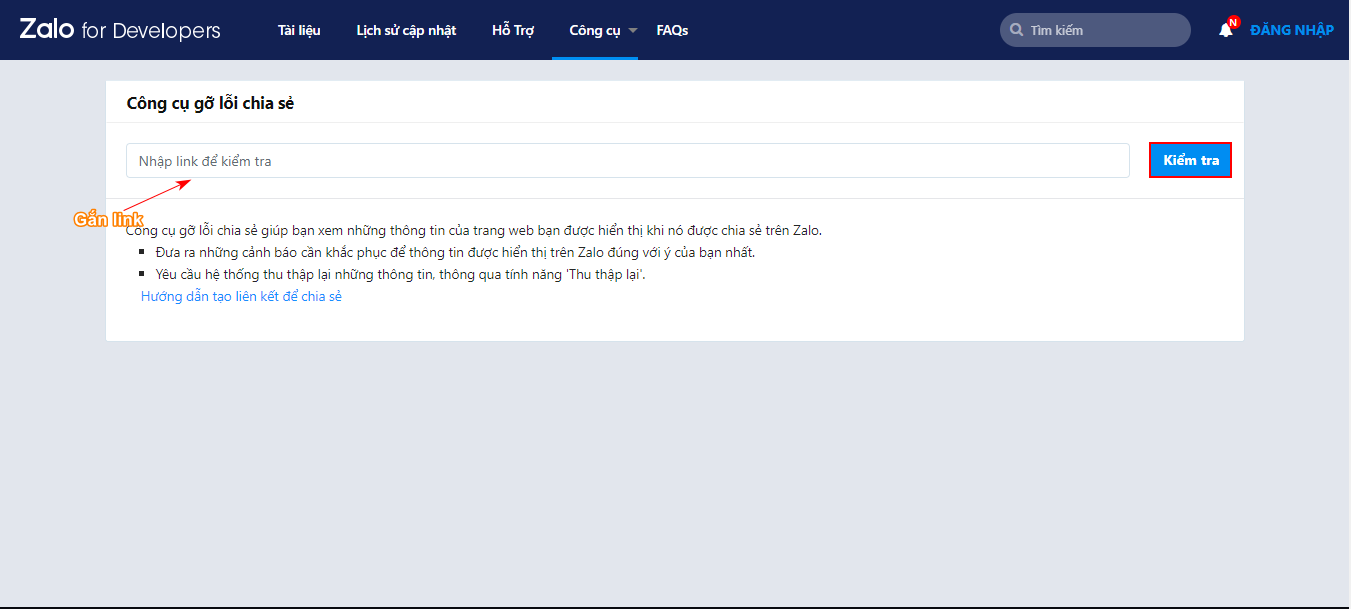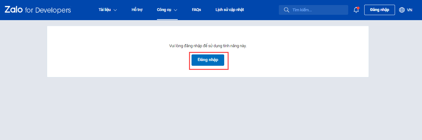 Bước 1: Bạn truy cập vào trang:https://developers.zalo.me/tools/debug-sharing. và chọn Đăng nhập.