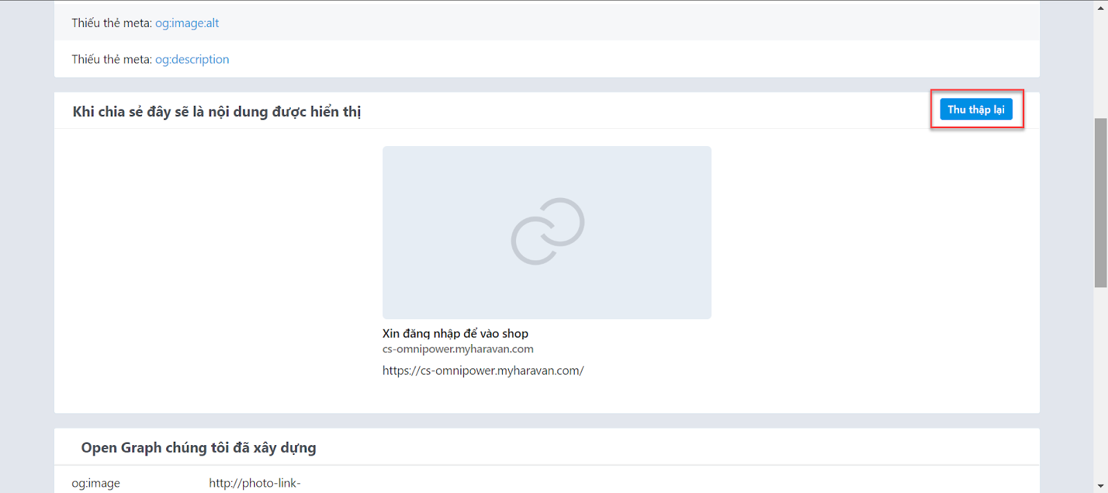 Zalo, Facebook sẽ cần một khoảng thời gian để cập nhật lại hình ảnh, nên chưa cập nhật ngay sau khi website có sự thay đổi. Do đó, nhà bán hàng cần thực hiện thao tác Debug lỗi chia sẻ hình ảnh để thông báo cho Zalo, Facebook rằng website đã có hình ảnh mới, vui lòng cập nhật lại.