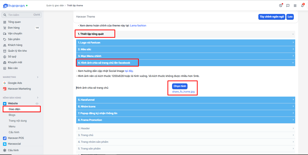 Vào Website -> Giao diện -> Thiết lập theme -> 1. Thiết lập tổng quát -> Hình ảnh chia sẻ trang chủ lên facebook