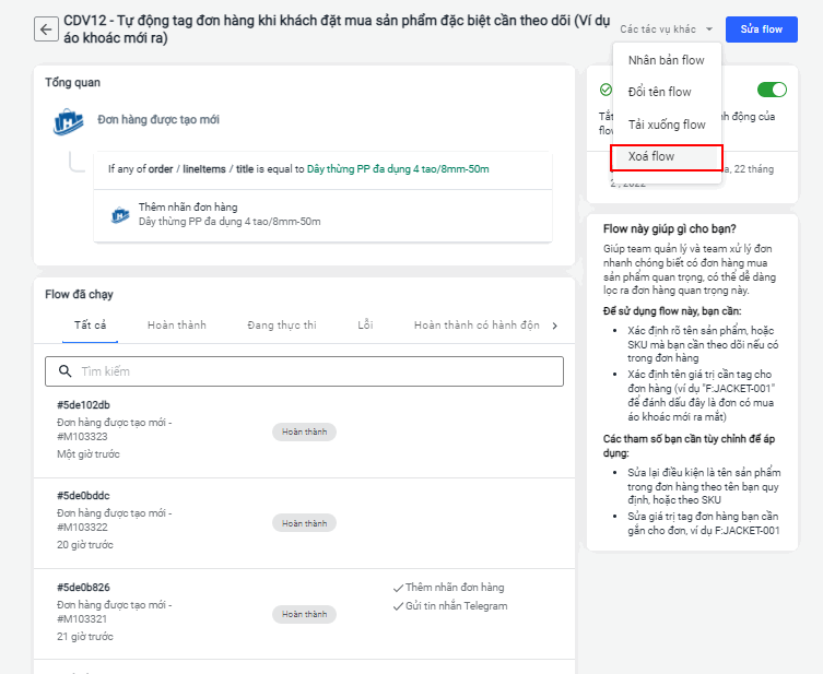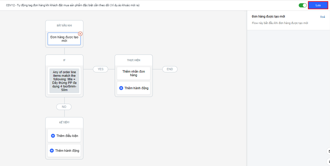 Vậy là bạn đã hoàn tất việc thiết lập flow Tự động tag đơn hàng khi khách đặt mua sản phẩm đặc biệt cần theo dõi (Ví dụ áo khoác mới ra).