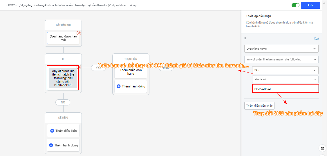- Thực hiện chỉnh sửa điều kiện khởi chạy flow và tên nhãn muốn gắn cho đơn hàng.