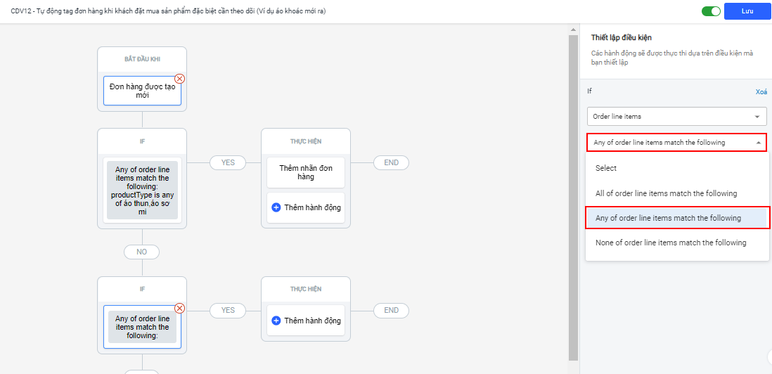 Sau đó, bạn chọn tiếp Any of order line items match the following