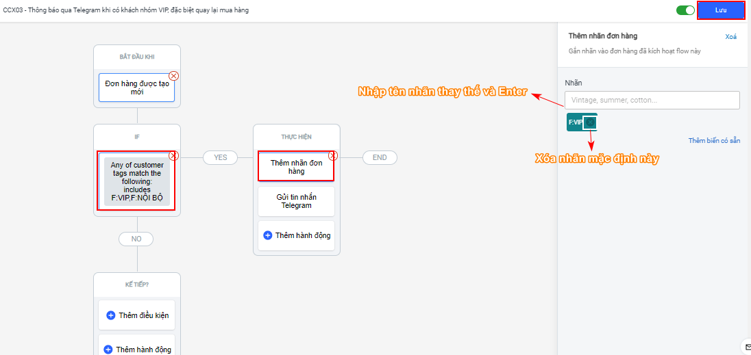 - Bạn chọn ô điều kiện và chọn ô Thêm nhãn đơn hàng. Tại đây, bạn thực hiện xóa nhãn mặc định và thêm tên nhãn muốn thay thế vào.