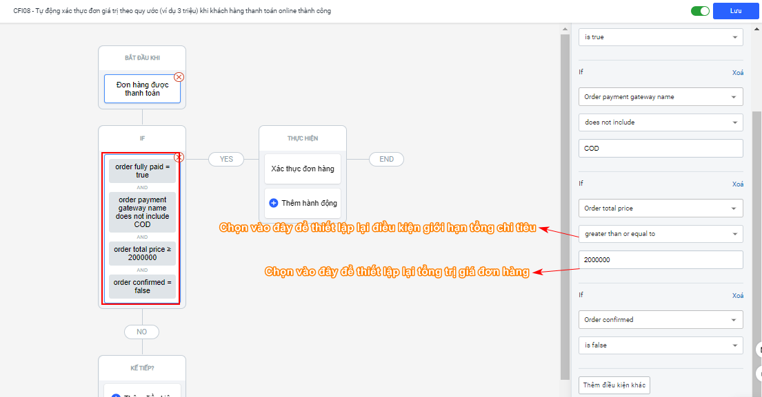 Haravan Flow CFI08 - Tự động xác thực đơn giá trị theo quy ước (ví dụ 3 triệu) khi khách hàng thanh toán online thành công