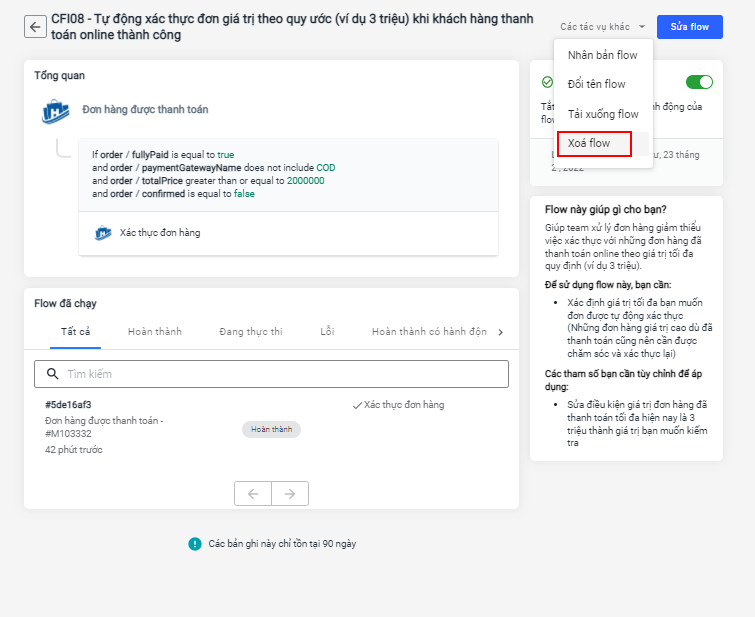 Flow sẽ tự động xác thực khi đơn được thanh toán online thành công và có giá trị theo quy ước thiết lập trong flow.