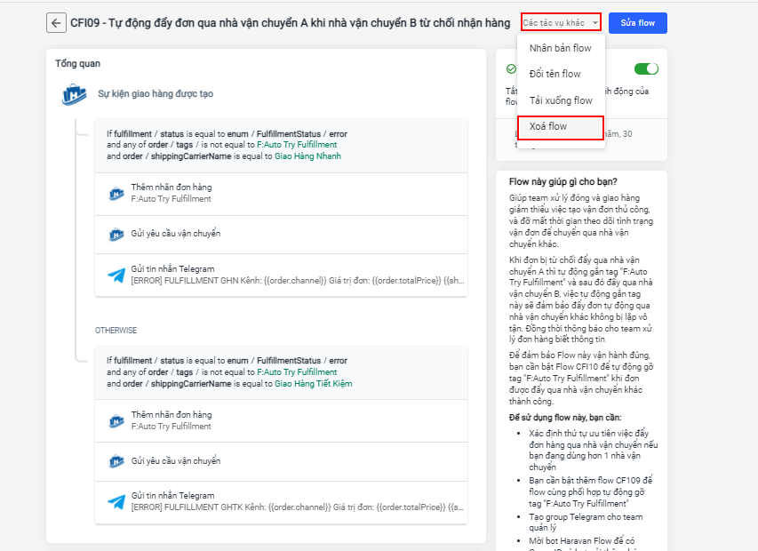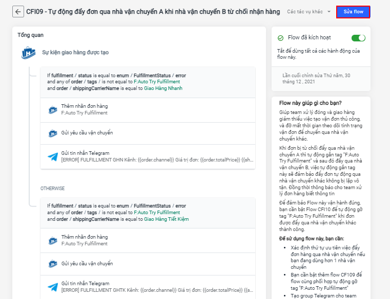 Giúp team xử lý giao hàng tiết kiệm thời gian tạo vận đơn thủ công và theo dõi tình trạng vận đơn để chuyển qua nhà vận chuyển khác. Flow này cần kết hợp với Flow CFI10 - Tự động gỡ tag "F:Try Auto Fulfillment" khi đơn gửi lại qua nhà vận chuyển khác thành công để có thể hoạt động đúng và hiệu quả. Xem hướng dẫn thiết lập flow tại đây.