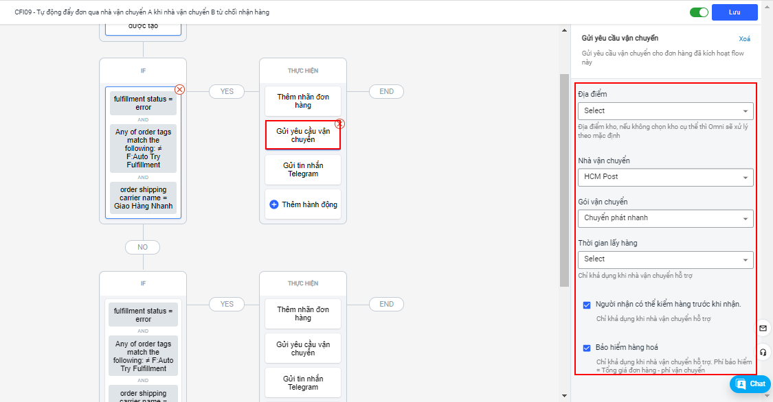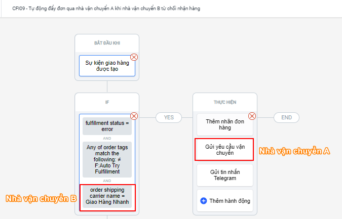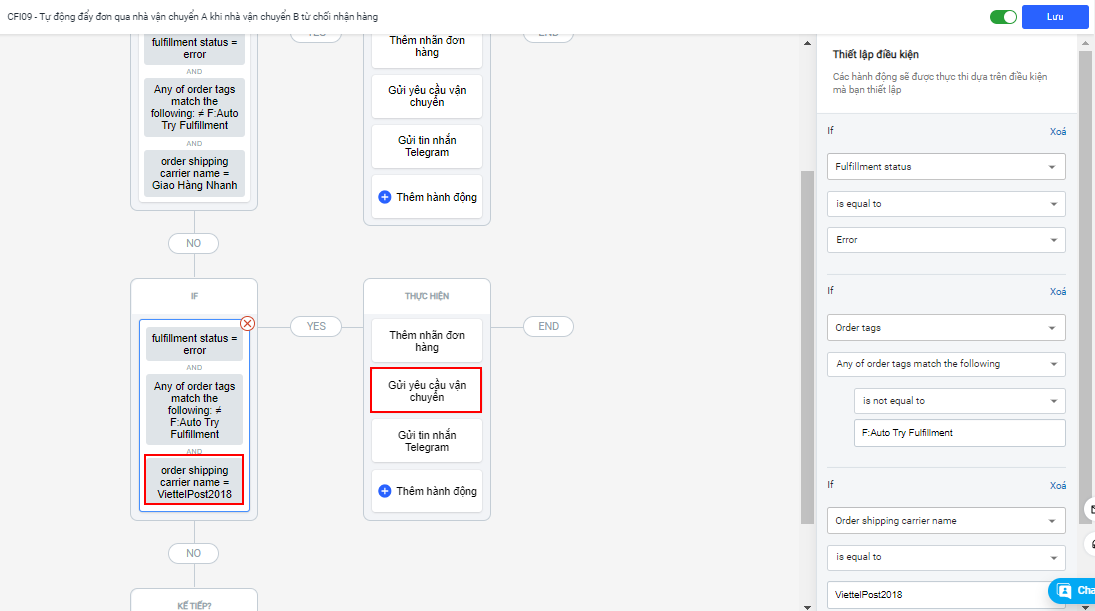 Vậy là bạn đã hoàn thành việc thiết lập flow CFI09 - Tự động đẩy đơn qua nhà vận chuyển A khi nhà vận chuyển B từ chối nhận hàng.