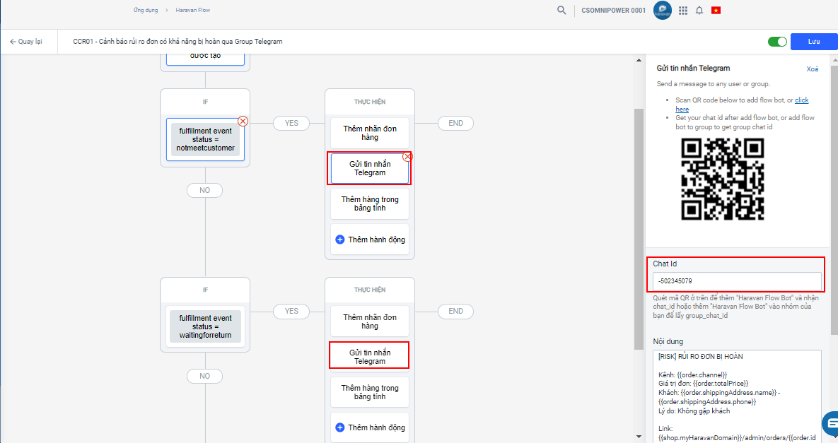 - Gắn group ID Telegram vào Flow: