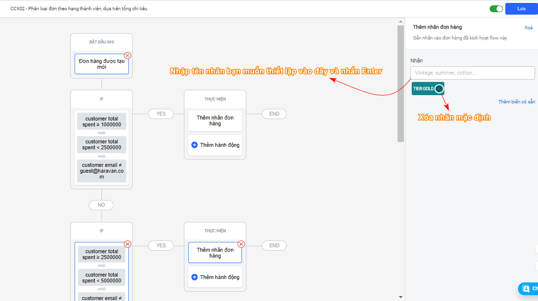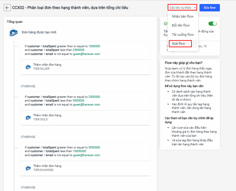 Flow sẽ tự động gắn nhãn đơn hàng theo hạng thành viên, để nhân viên có thể có thể xử lý phù hợp. Hiện hệ thống đang mặc định các nhãn đơn hàng là TIER:SILVER; TIER:GOLD; TIER:DIAMOND; TIER:PLATINUM.