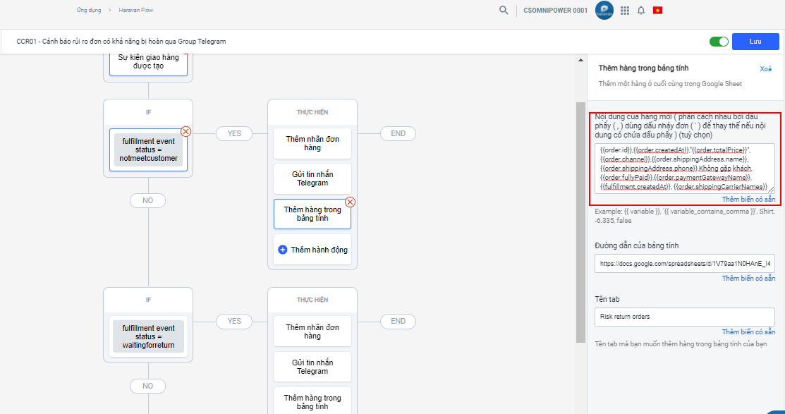 Những cột thông tin trong bảng báo cáo được thiết lập trong flow mẫu do đó nếu bạn muốn Haravan flow cập nhật thêm các thông tin mình mong muốn, bạn cần thay đổi thiết lập ở đây.