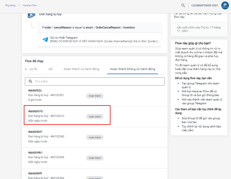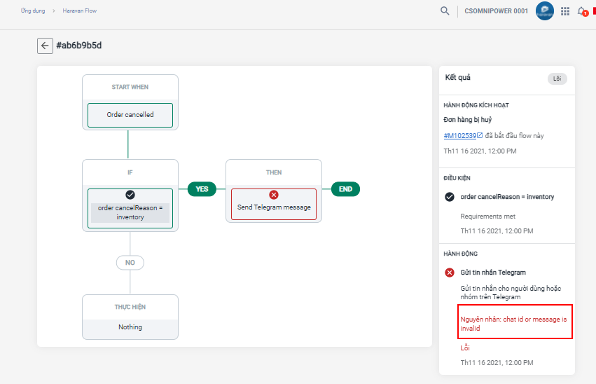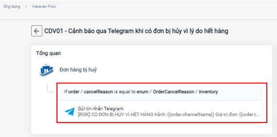 Ví dụ: Flow bên dưới sẽ bắt đầu khi có một đơn hàng mới được tạo và nếu đơn hàng đó bị hủy với lý do hết hàng, ứng dụng sẽ gửi tin nhắn tới group telegram.
