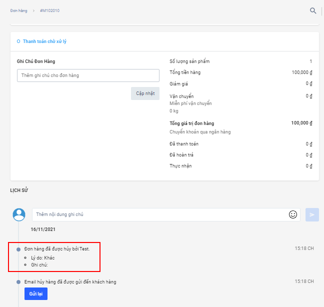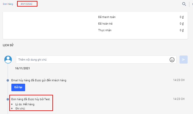 Ví dụ: Đơn hàng #M102542 hoàn thành có hoạt động là do đơn hàng bị hủy vì lý do Hết hàng (đúng với điều kiện)
