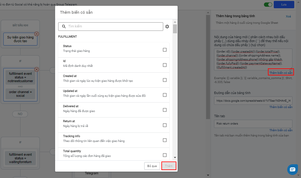 - Bạn nhấn Thêm sau khi đã chọn xong các biến và thêm dấu phẩy giữa các biến thông tin để có thể tách cột cho mỗi biến thông tin. Nếu không có dấu phấy giữa các biến, thông tin khi được đồng bộ sẽ được ghi vào chung 1 cột.