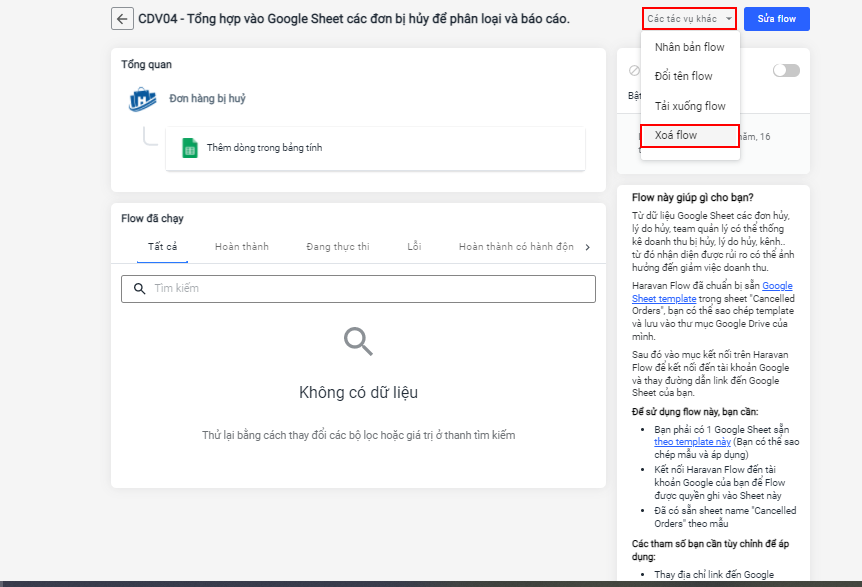 Hiện tại Haravan Flow chưa hỗ trợ xóa hàng loạt nên bạn chỉ có thể thực hiện thao tác xóa thủ công bằng cách vào từng flow, chọn Các tác vụ khác và chọn xóa Flow.