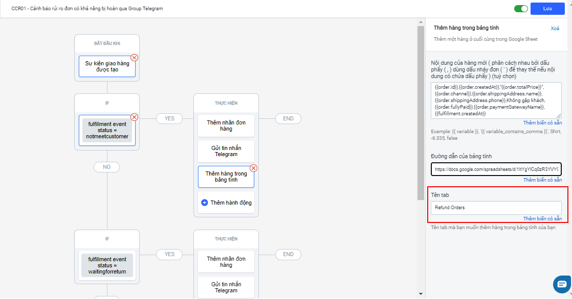 Vậy là bạn đã thực hiện xong việc thiết lập Flow CCR01 - Cảnh báo rủi ro đơn có khả năng bị hoàn qua Group Telegram.