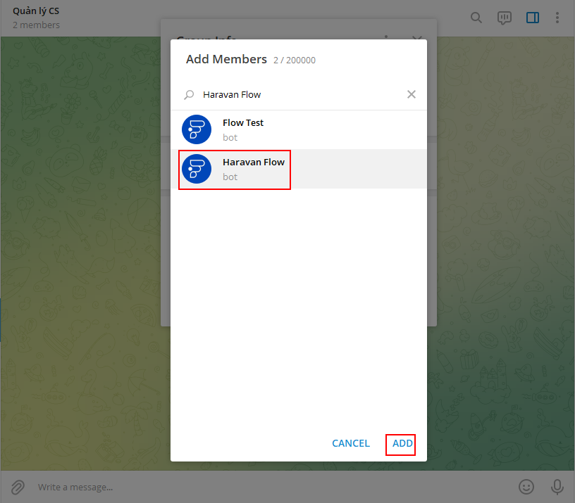 - Nhập tìm Haravan Flow trong ô tìm kiếm và chọn thêm Haravan Flow, bot sẽ gửi một dãy số là group ID.