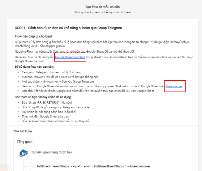 Trước khi gắn link google sheet vào flow bạn cần tạo một bản sao từ flow mẫu được cung cấp sẵn, hoặc tự tạo một sheet riêng từ tài khoản google đang kết nối với ứng dụng.