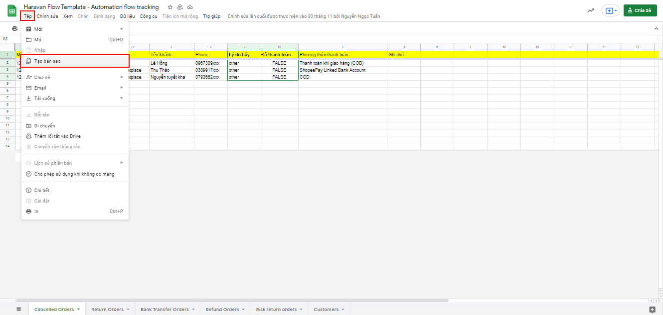 Thông tin các đơn bị hủy sẽ được tự động tổng hợp vào một bảng sheet giúp bạn có thể theo dõi, từ đó đưa ra được những giải pháp cải thiện kịp thời.