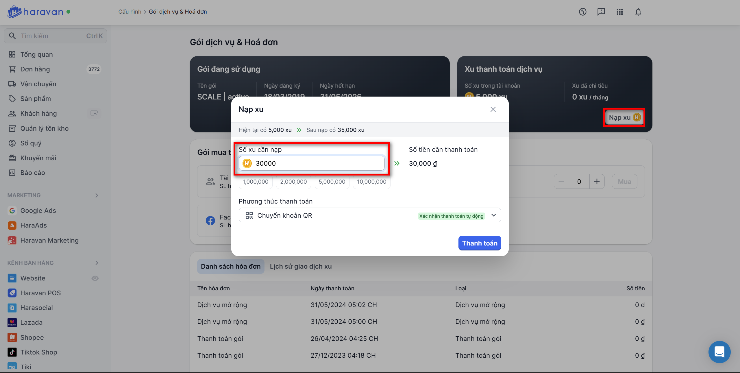 - Nạp xu để sử dụng các kênh gửi tin tiếp thị như Zalo ZNS, SMS, Email,...(Nhà bán có thể nạp xu nhưng hiện các kênh gửi tin tiếp thị vẫn đang phát triển và chưa sẵn sàng để sử dụng)