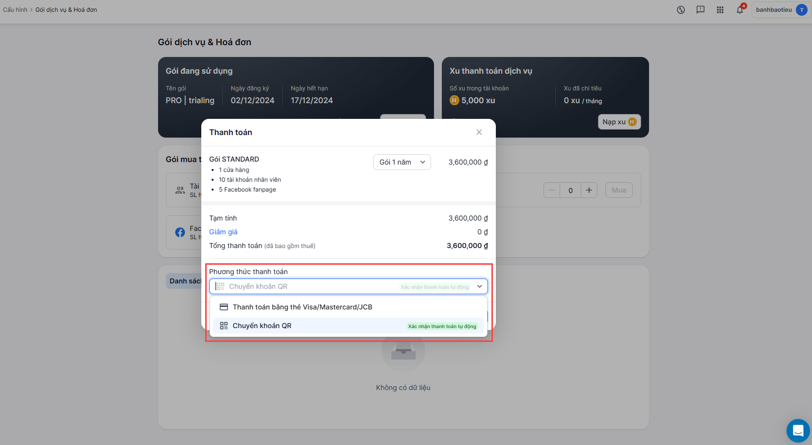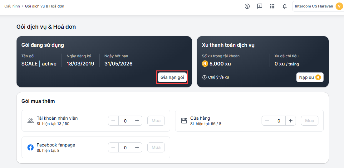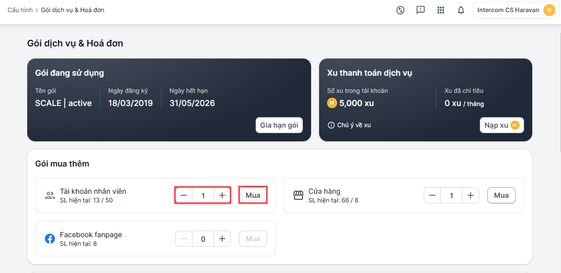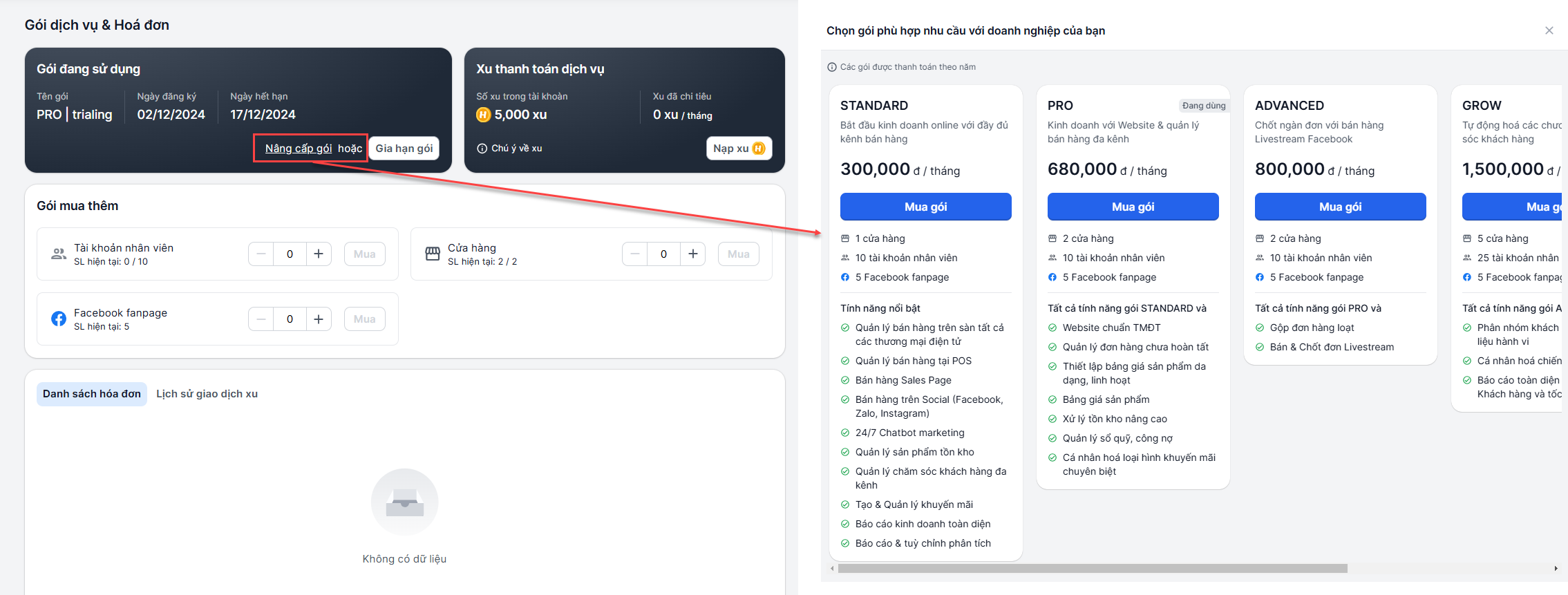 - Gói mua thêm (số lượng tài khoản nhân viên, cửa hàng và Facebook Fanpage)