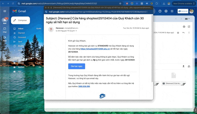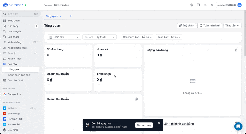 Để tránh ảnh hưởng đến việc kinh doanh của nhà bán, Haravan sẽ gửi mail thông báo trước khi gói dịch vụ hết hạn và trên trang admin sẽ có các thông báo về thời gian hết hạn để nhà bán kịp thời gia hạn.