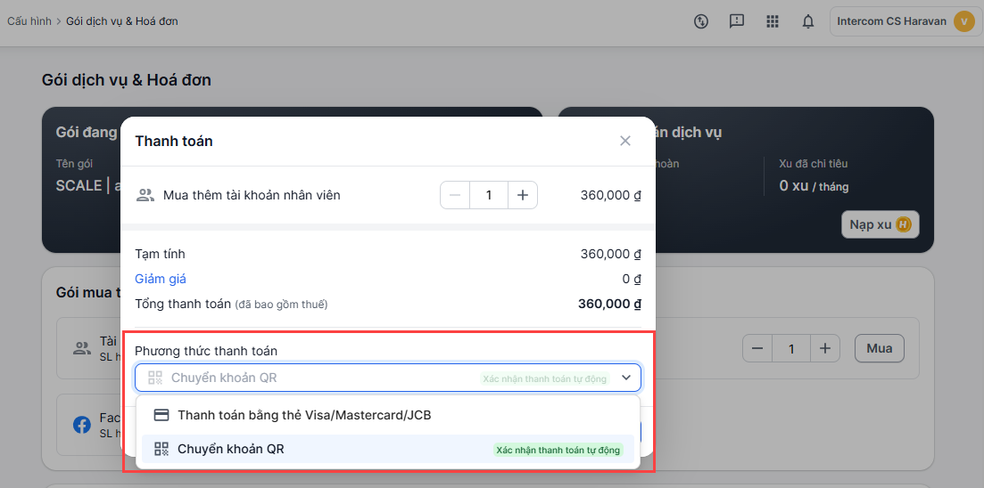- Chọn phương thức thanh toán Chuyển khoản QR hoặc Thanh toán bằng thẻ Visa/Mastercard/JCB