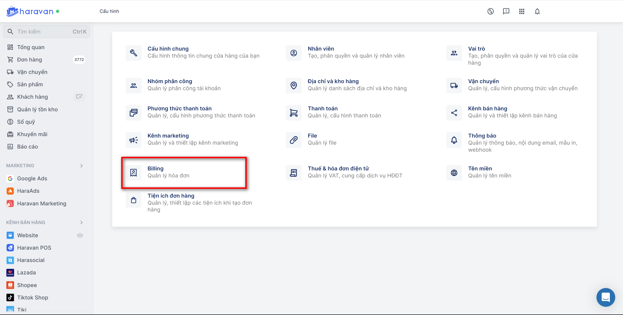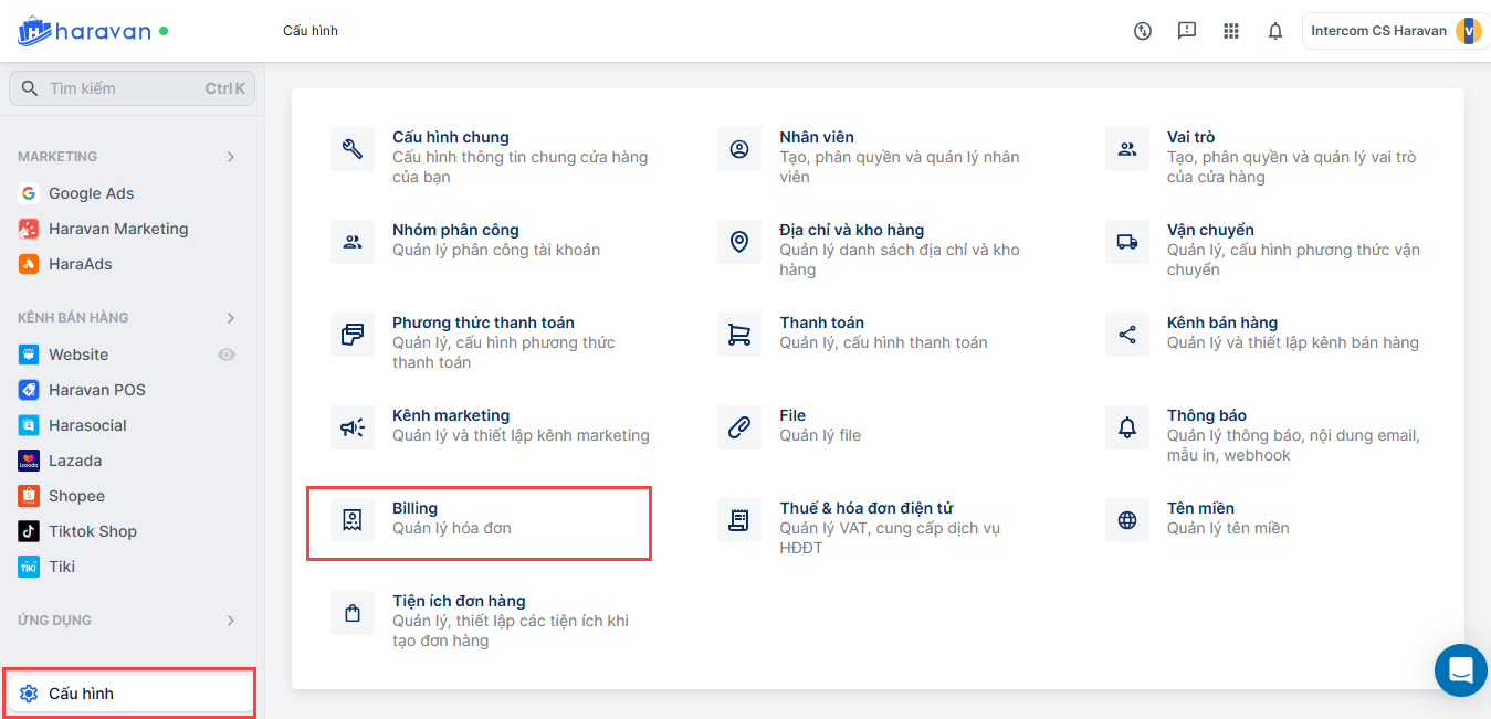 - Truy cập vào admin Haravan, mục Cấu hình và chọn Billing.