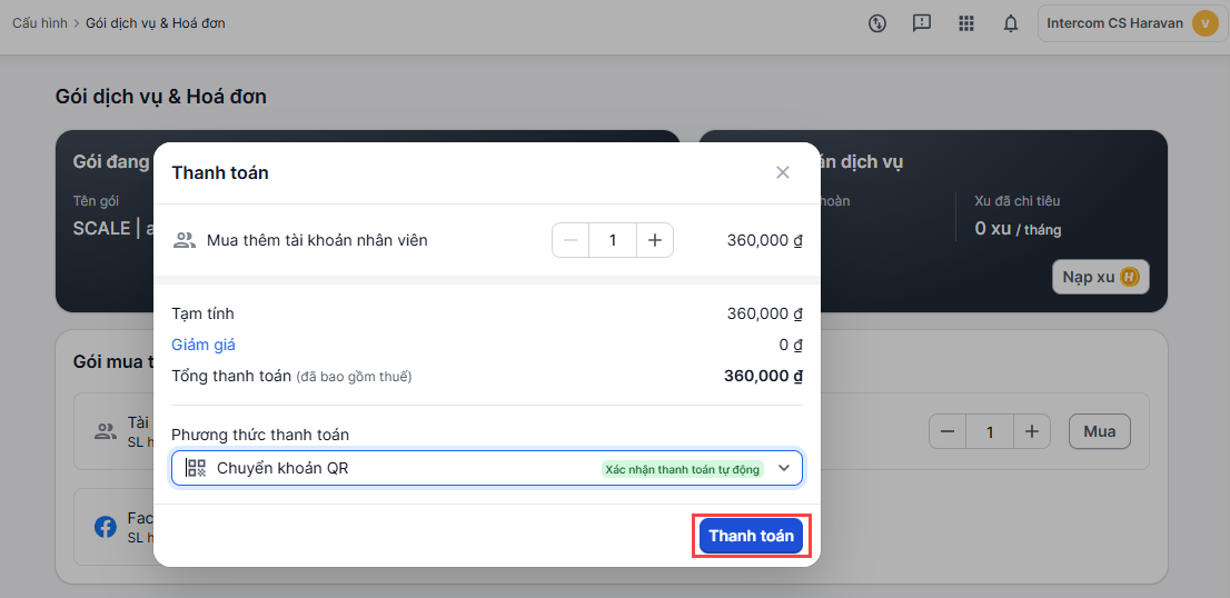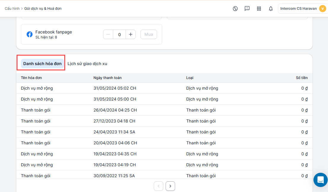 Sau mỗi giao dịch nâng cấp/gia hạn gói hoặc thanh toán gói mua thêm, thông tin giao dịch sẽ được ghi nhận vào danh sách hóa đơn.