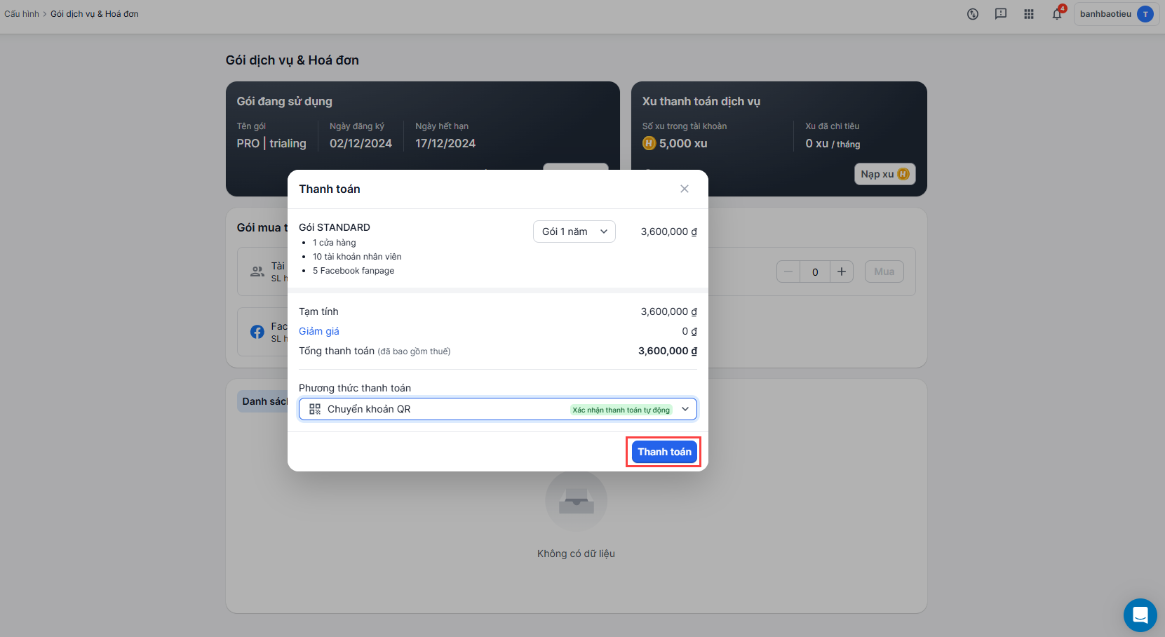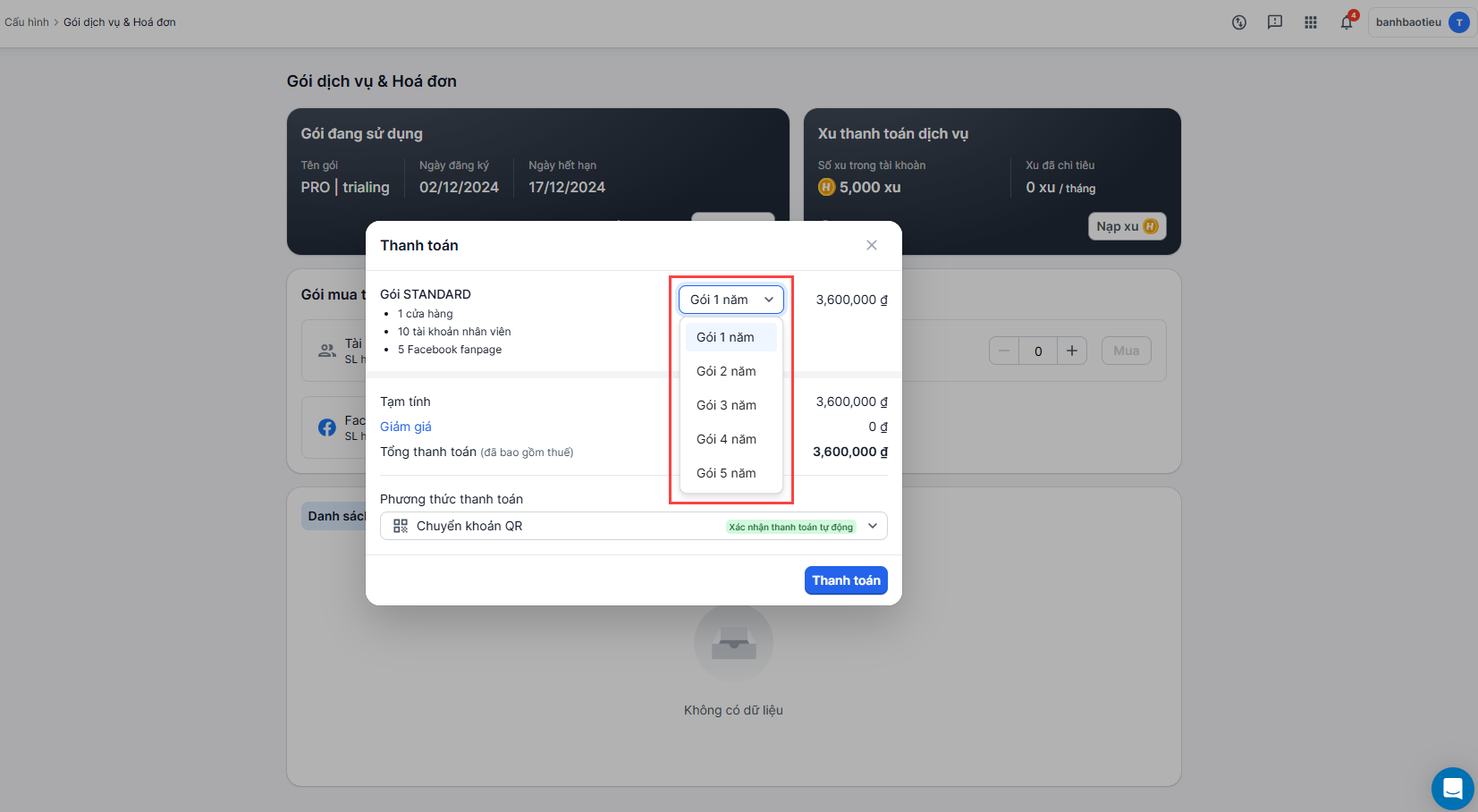 Thanh toán/Nâng cấp/Gia hạn gói dịch vụ (Cấu hình Billing)