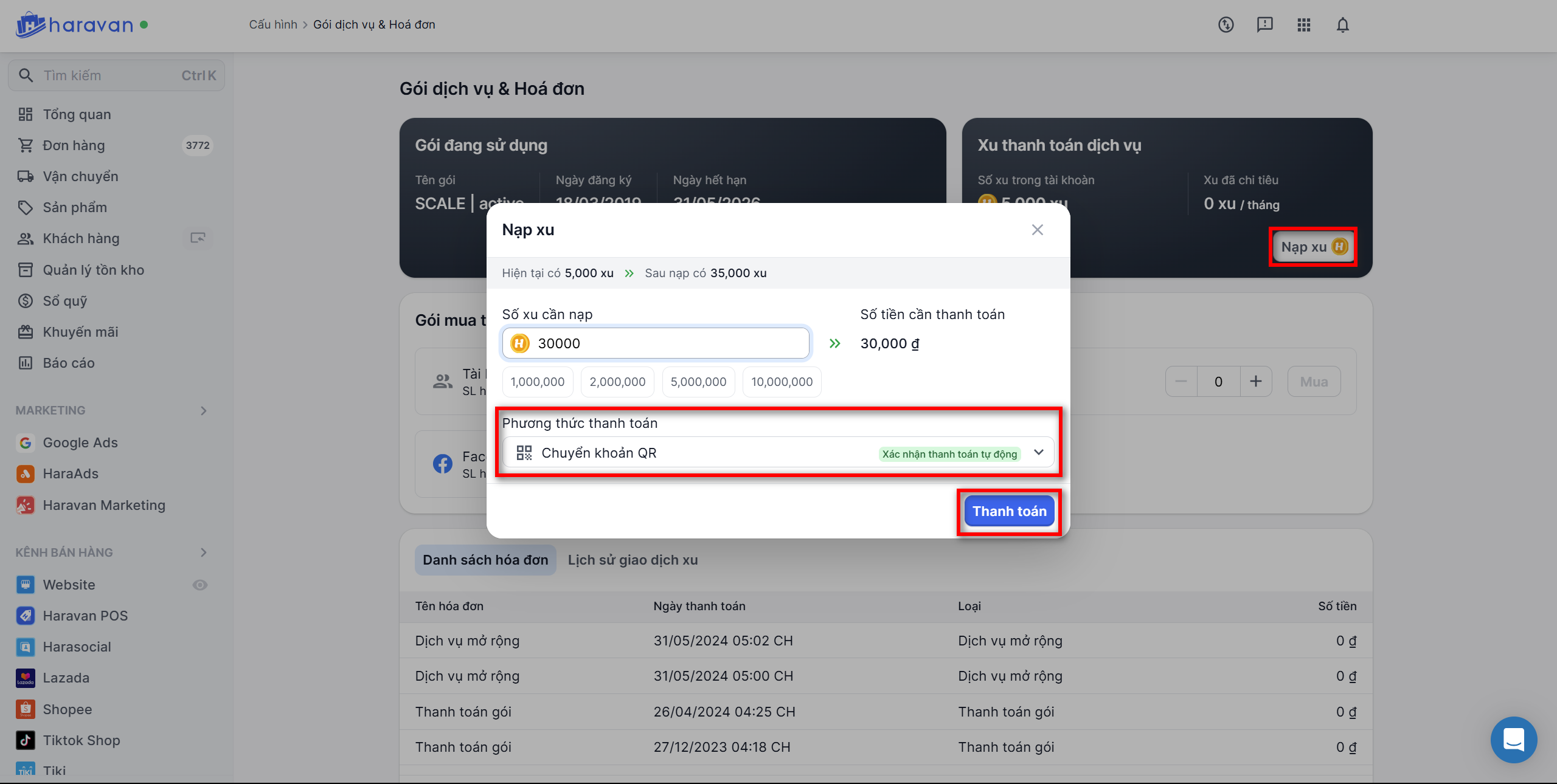 Ngoài ra, người bán còn có thể thao tác thanh toán trên admin Haravan và nâng cấp gói dịch vụ để có nhiều dịch vụ tiên tiến hơn phục vụ việc kinh doanh của người bán.