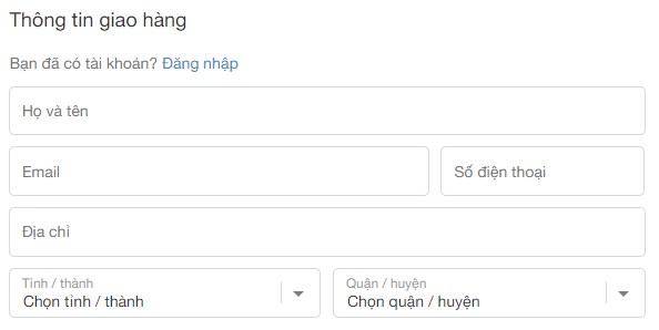 Ví dụ: Bạn có thể làm trang thông tin giao hàng như dưới đây. Ngoài ra bạn có thể cài đặt cho khách hàng lựa chọn địa điểm thay vì nhập tay thủ công cũng là một cách tối ưu đó bạn nha.