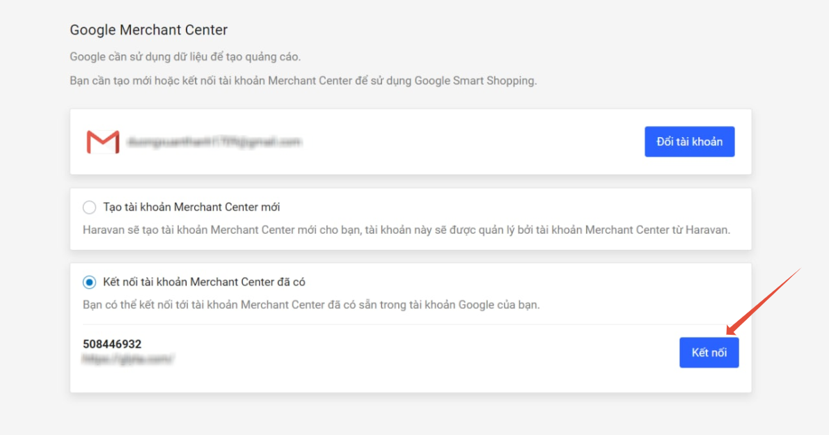 **Bước 04:**Chờ 5 phút sau vào lại menu Google Shopping trong trang hệ thống (Lưu ý: tải lại website trước khi thực hiện). Sau đó nhấp vào "Kết nối tài khoản Merchant Center đã có" > chọn "Kết nối" tại tài khoản bạn muốn triển khai (tức tài khoản bạn vừa sửa đổi) và thực hiện các bước tiếp theo.