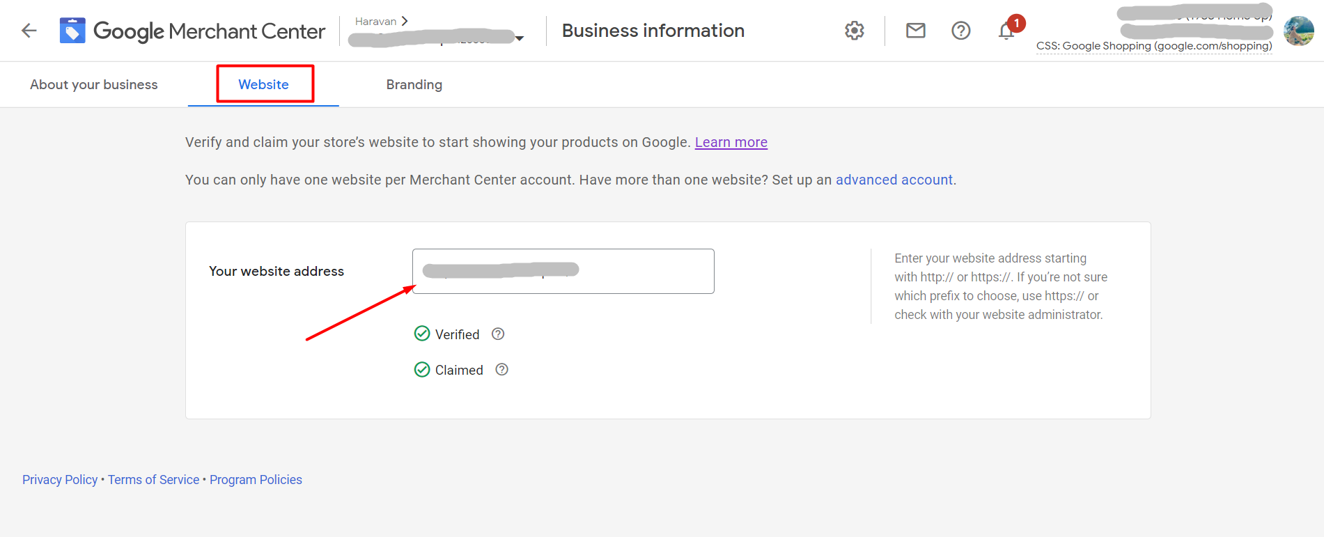 Bước 02: Vì tài khoản Google Merchant Center này đang trỏ về website khác (không phải website bạn muốn triển khai Google Shopping) nên bạn cần điều chỉnh lại thông tin website bằng cách: