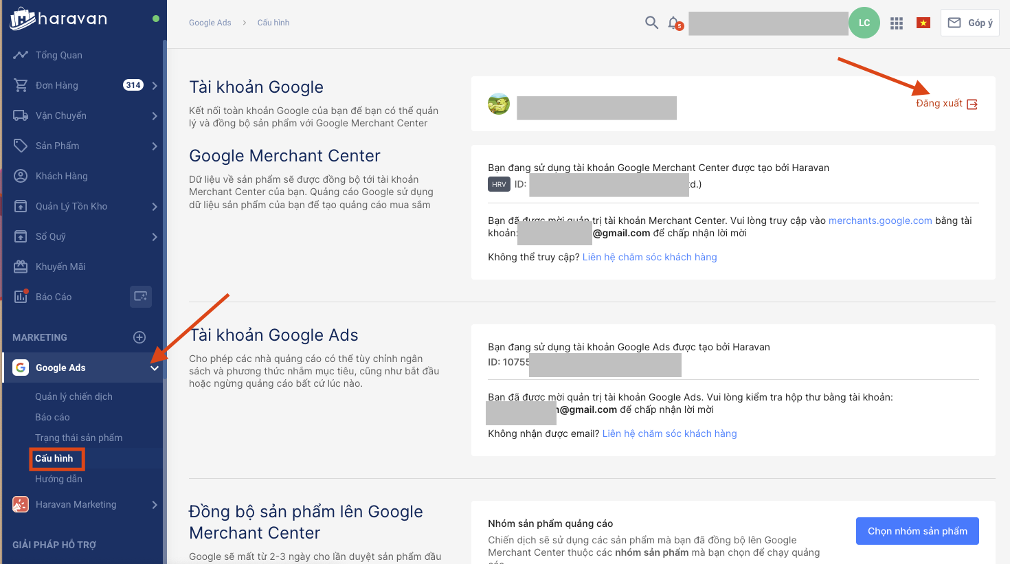 Đăng nhập vào trang quản trị Haravan >> Google Ads >> Cấu hình >> Đăng xuất