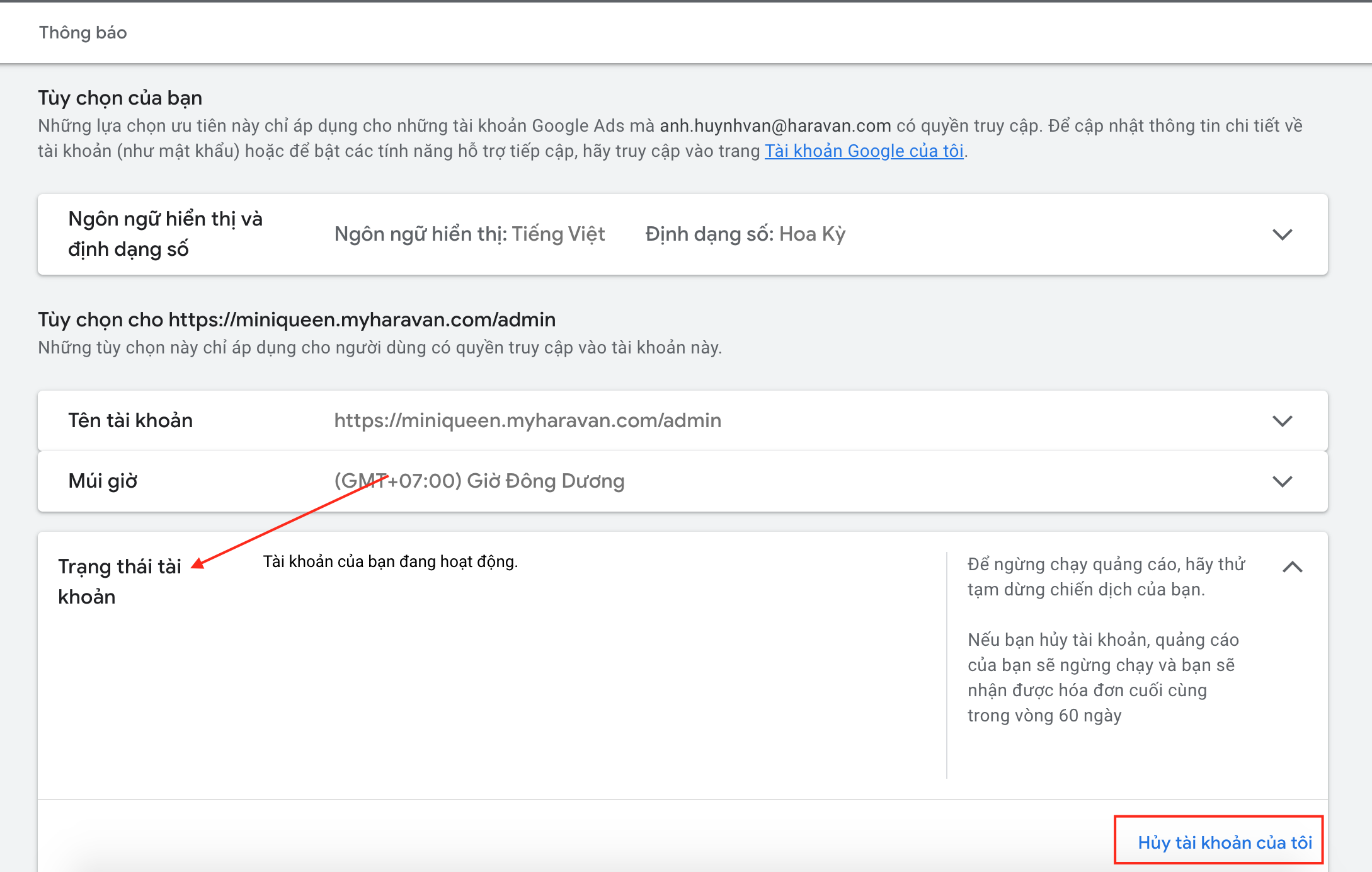 Đăng nhập vào tài khoản Ads cũ >> Lựa chọn ưu tiên >> Trạng thái tài khoản >> Hủy tài khoản