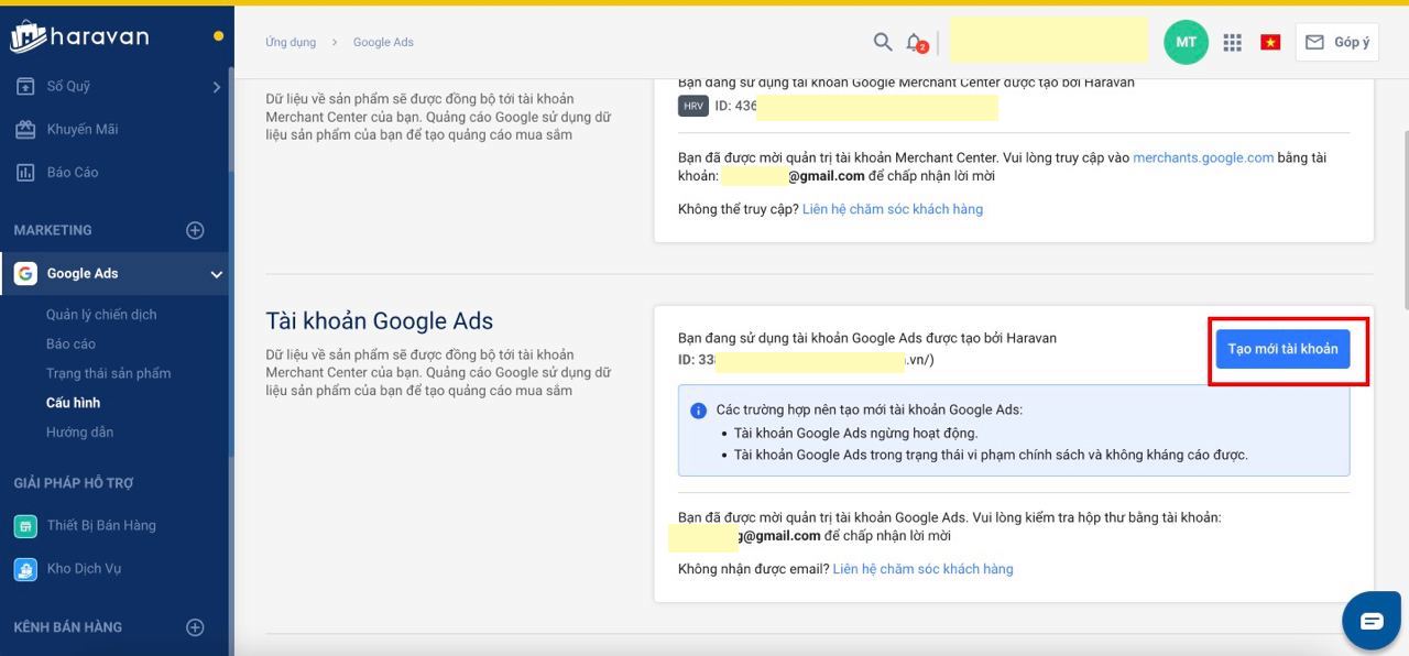 Nhấp chọn lại Menu " Google Ads" >> Liên kết mail mới vào Google Ads tại Haravan >> Kết nối lại Merchant Center cũ >> Vào "Cấu hình" >> Tạo mới tài khoản