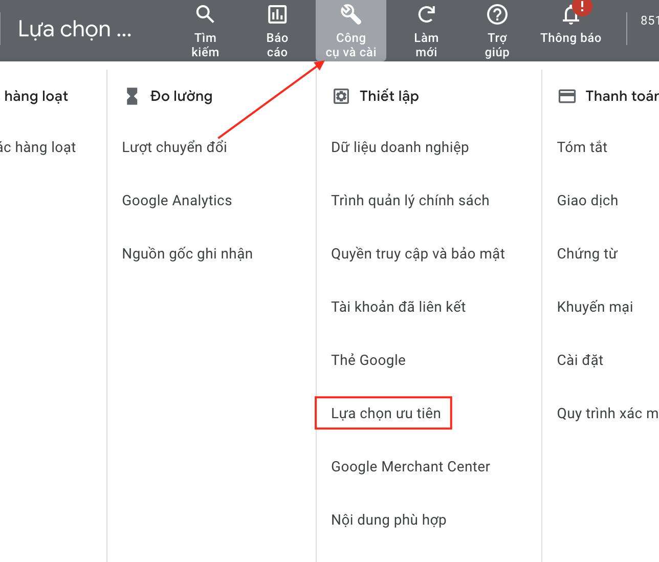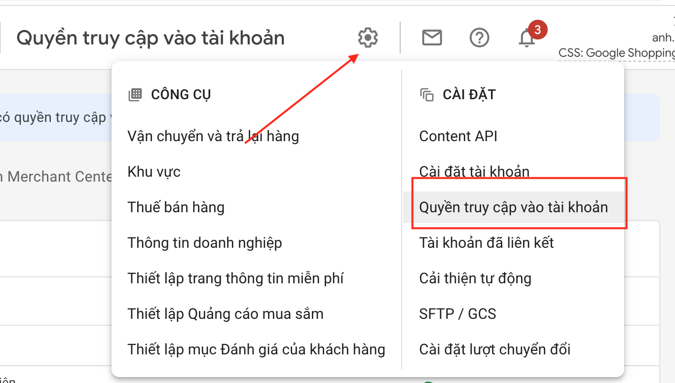 Đăng nhập vào Merchant Center của bạn >>Nhấp vào biểu tượng Cài đặt >> Quyền truy cập vào tài khoản