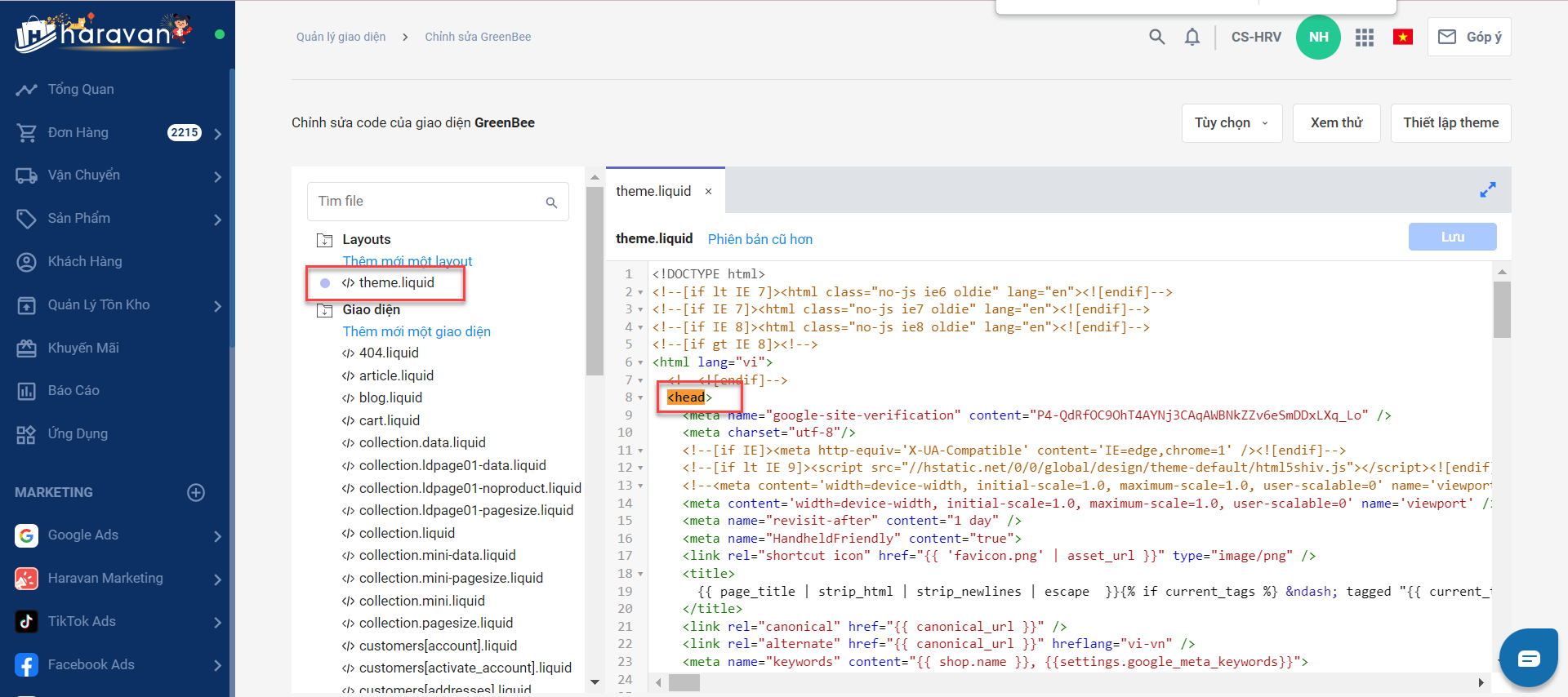 Sau khi bạn mở ra được giao diện như trên, nhìn sang cửa sổ bên phải bạn sẽ thấy dòng chữ màu xanhhead