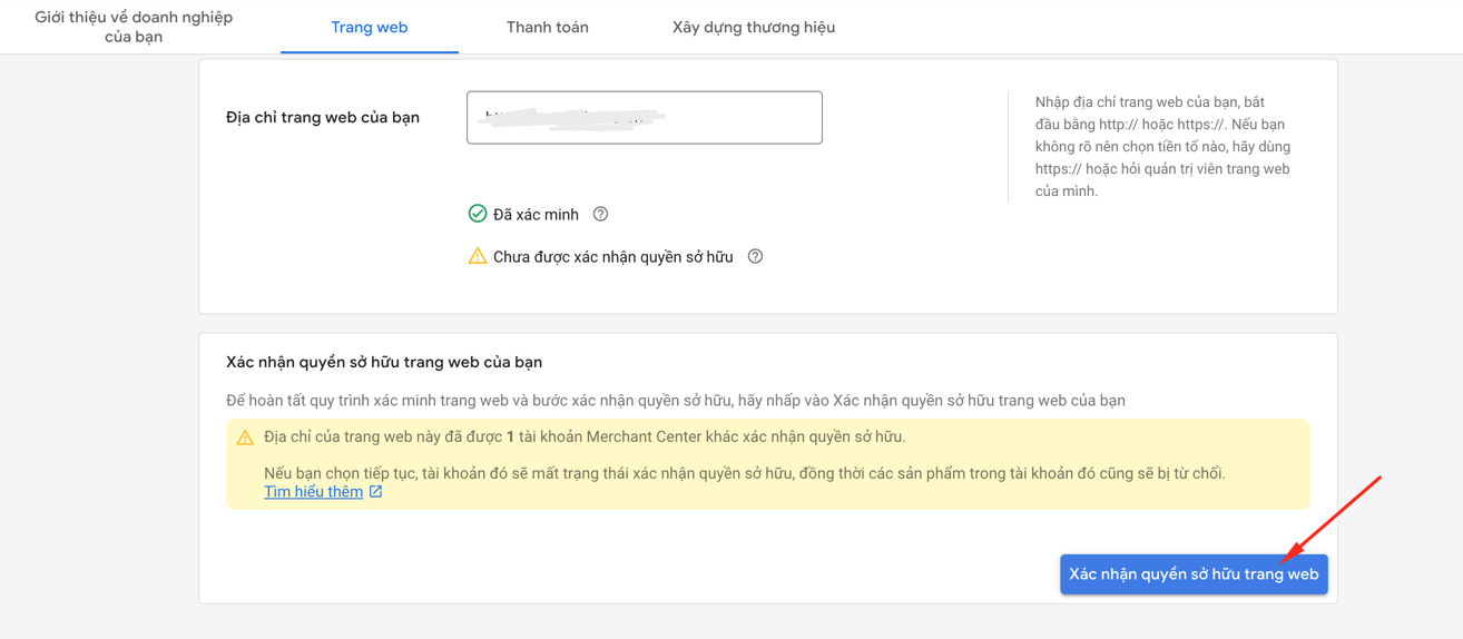 **Bước 04:**Quay lại tài khoản Google Merchant Center > Thông tin doanh nghiệp > Trang web > Bấm “Xác minh URL” (Verify websit**e**)