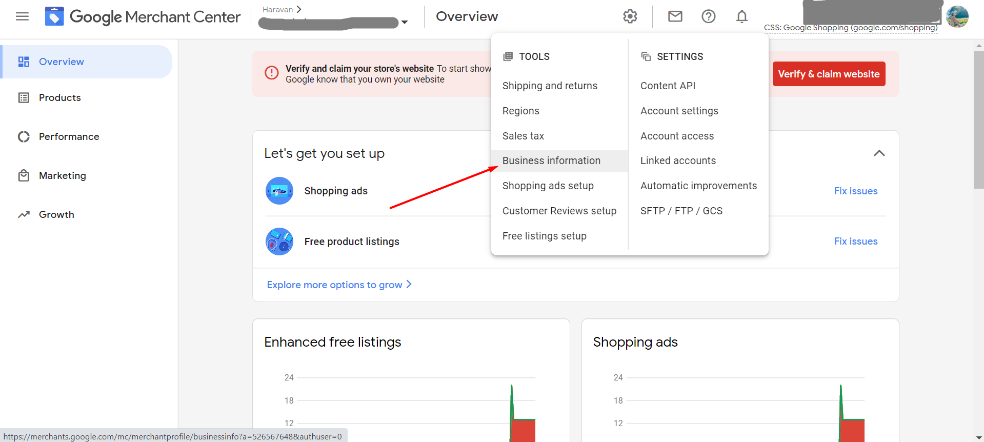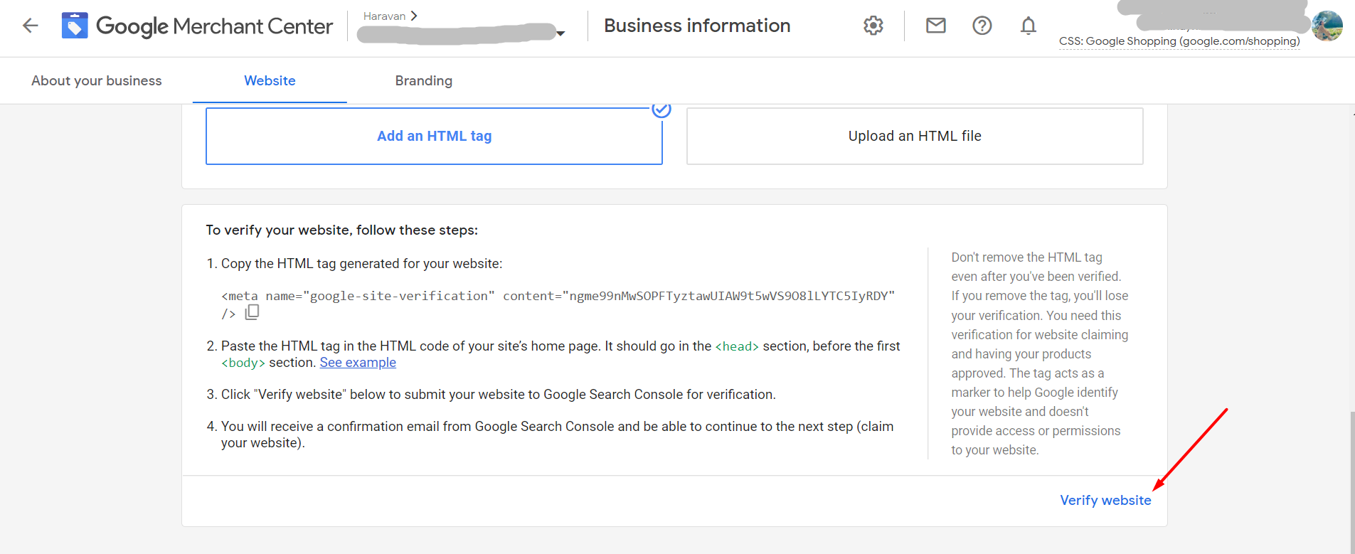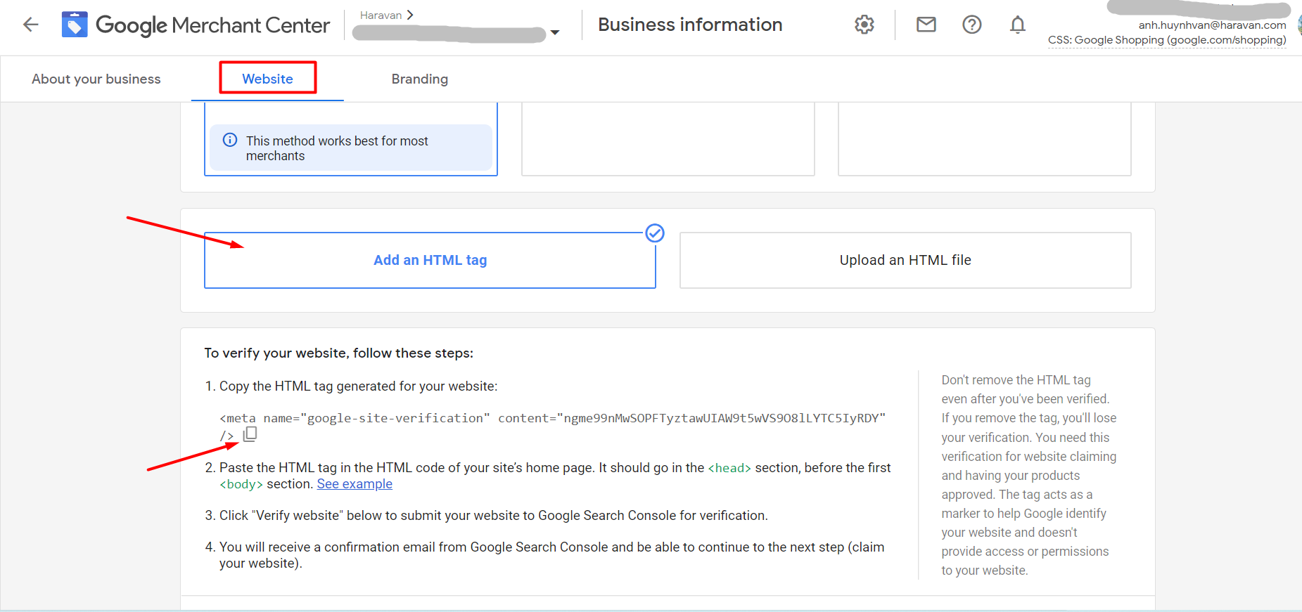 **Bước 01:**Vào tài khoản Google Merchant Center> Thông tin doanh nghiệp > Trang web> Sao chép Thẻ HTML mà Google cung cấp.
